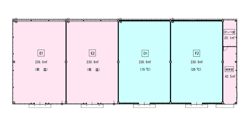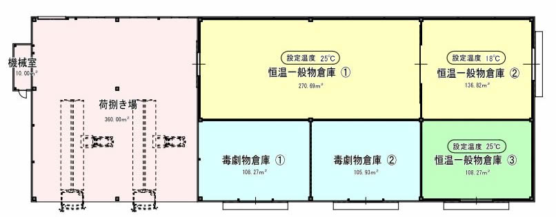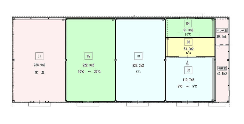 延べ面積は約730u、3室が温度管理可能です。また、荷捌き場も併設されています。